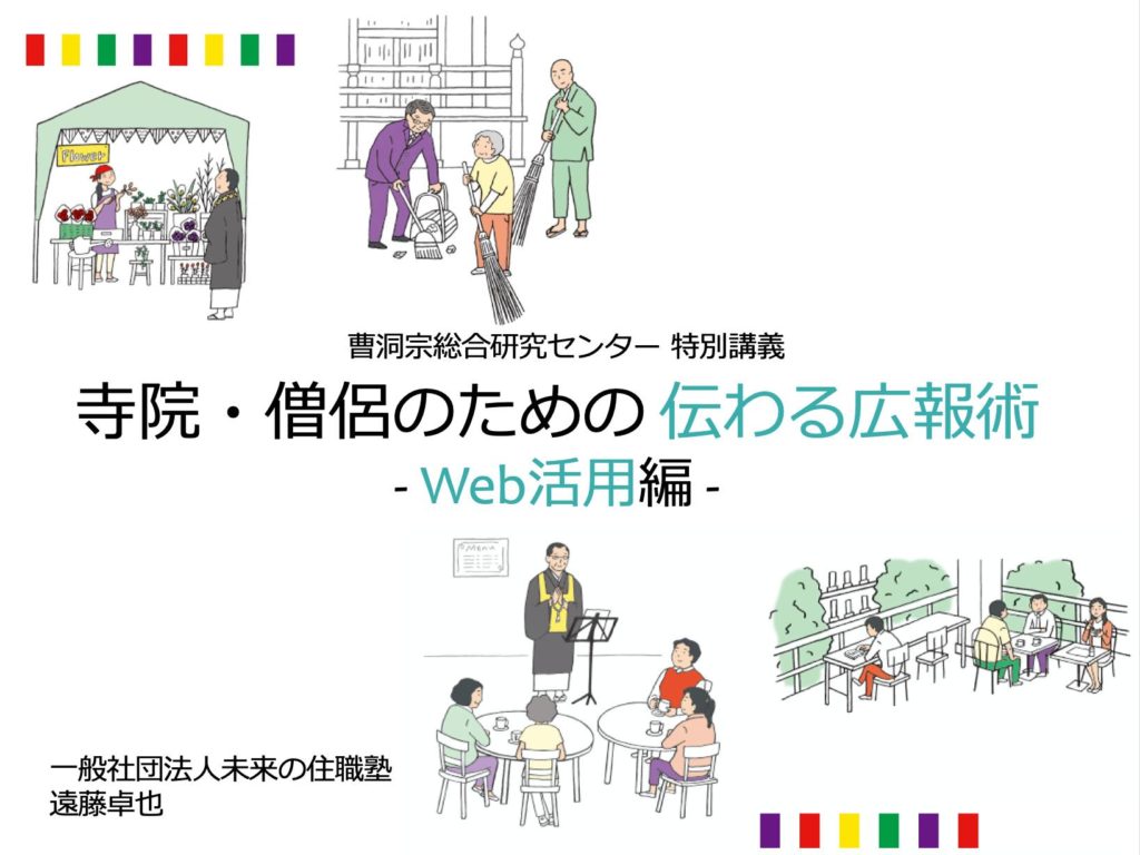 2時間のお時間をいただき「寺院・僧侶のための 伝わる広報術 -Web活用編-」というテーマにて、これまで遠藤講師が各地の寺院をサポートする中で培ってきた、お寺・僧侶のための広報術をレクチャーさせていただきました。