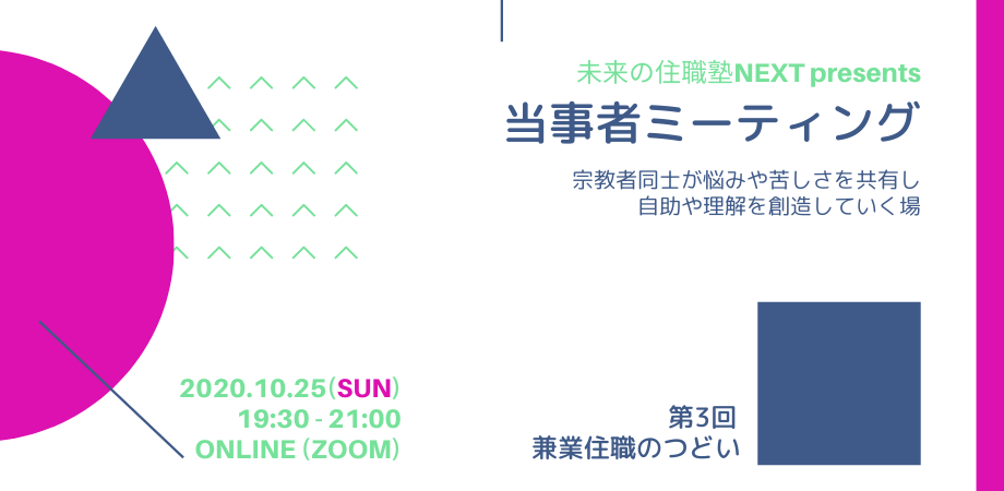10月25日に「宗教者のための当事者ミーティング – 兼業住職のつどい 第3回」を開催いたします。 今回は2〜3名の兼業宗教者の方による現状共有のあと、対談やブレイクアウトルームでの感想シェアリングなどを行い […]