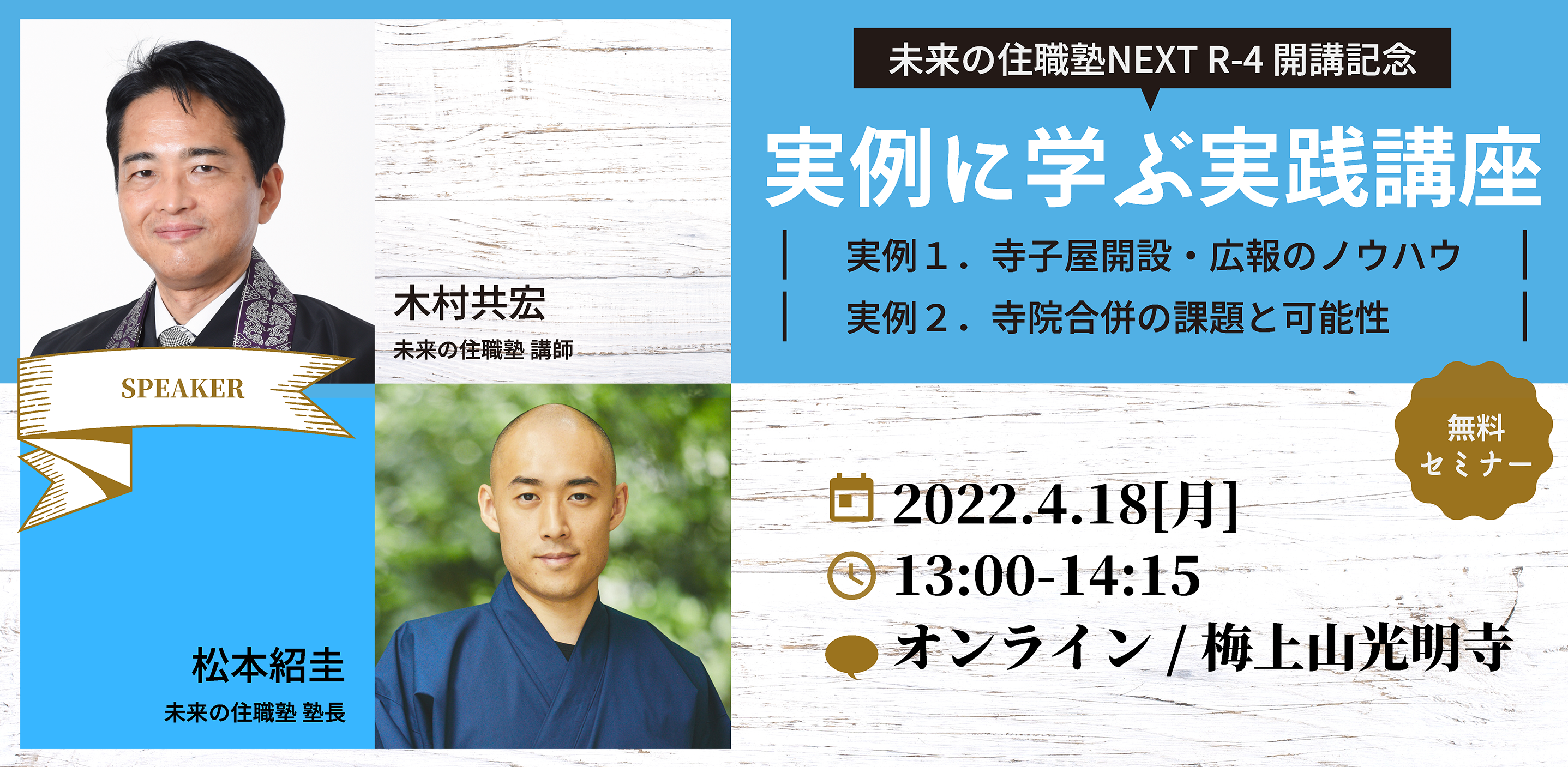 現在、願書受付中の「未来の住職塾NEXT R-4」の開講決定を記念して、無料講座を開催します! 今回は「実例に学ぶ実践講座」というタイトルで、これまでに全国各地の寺院から未来の住職塾に寄せられた数多くの相談の中から、2つ […]